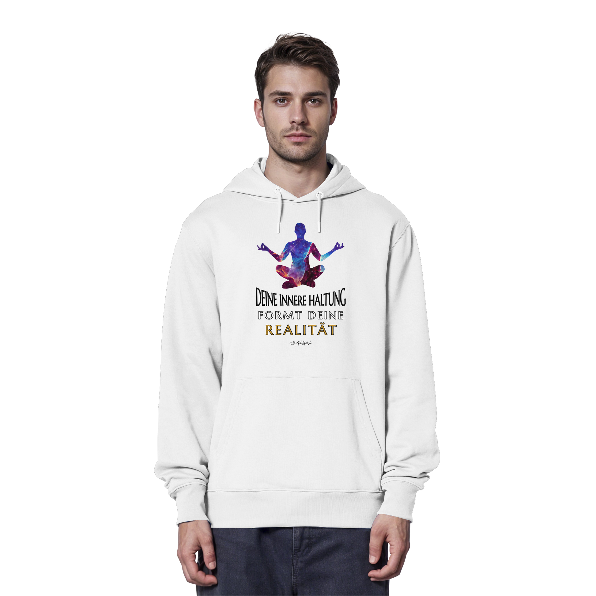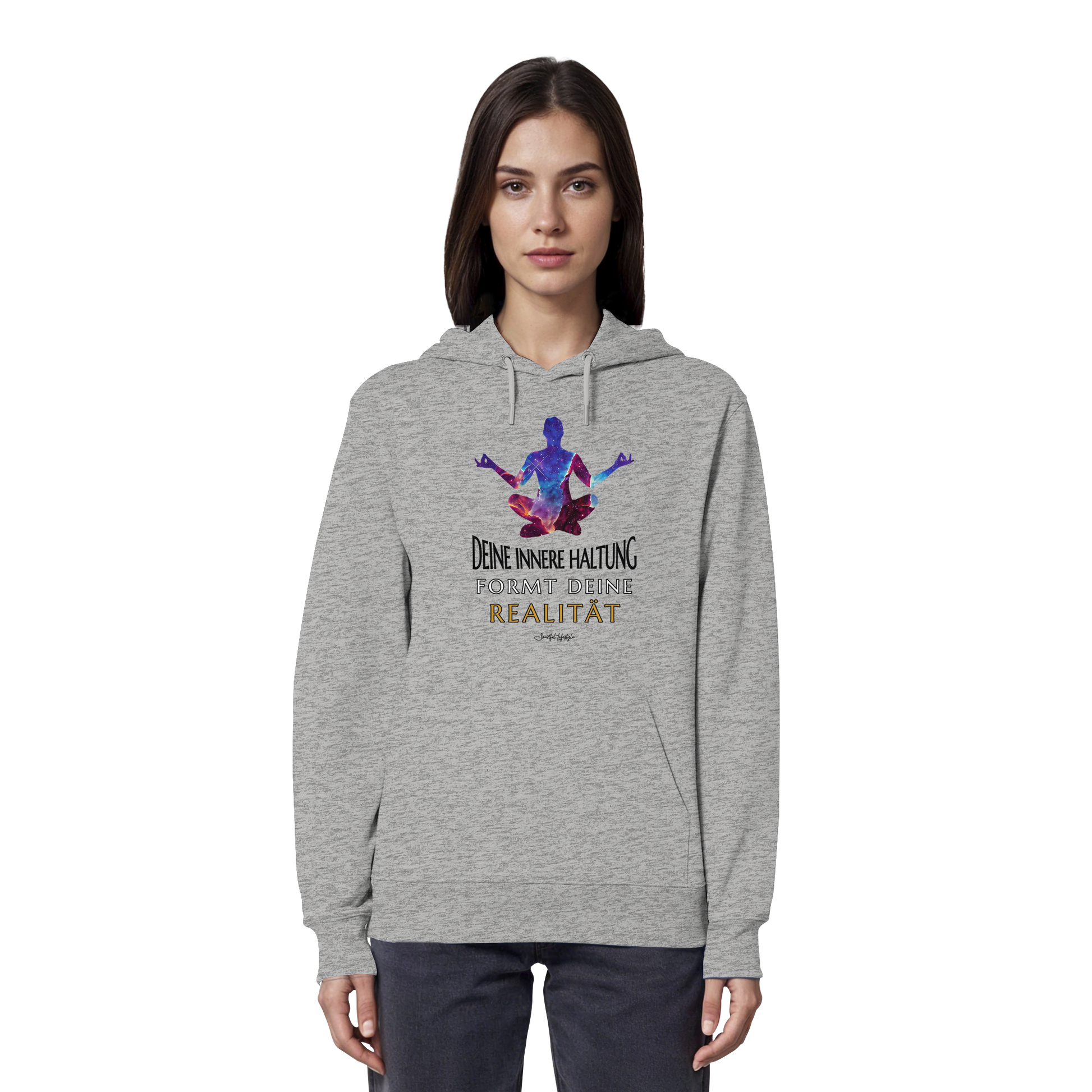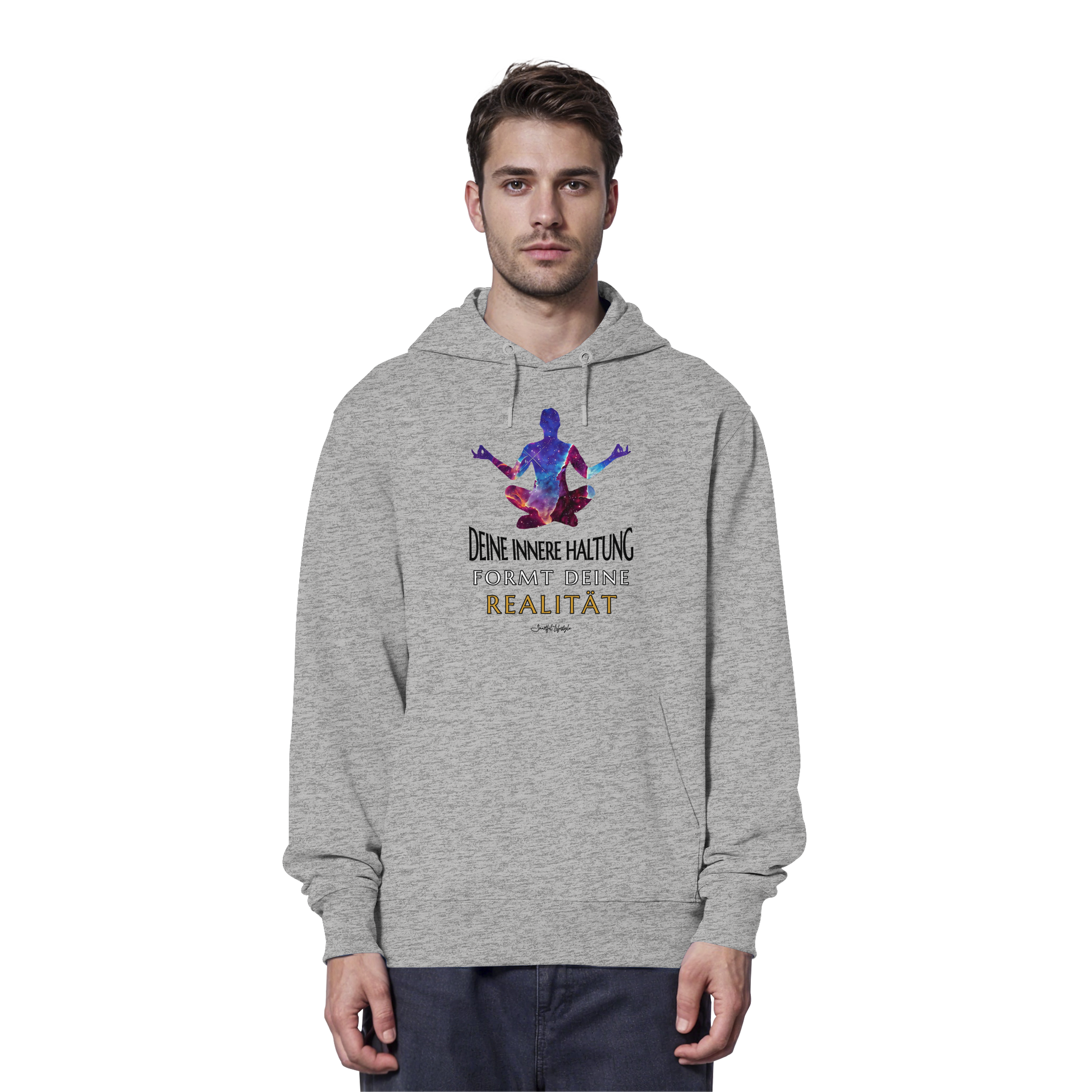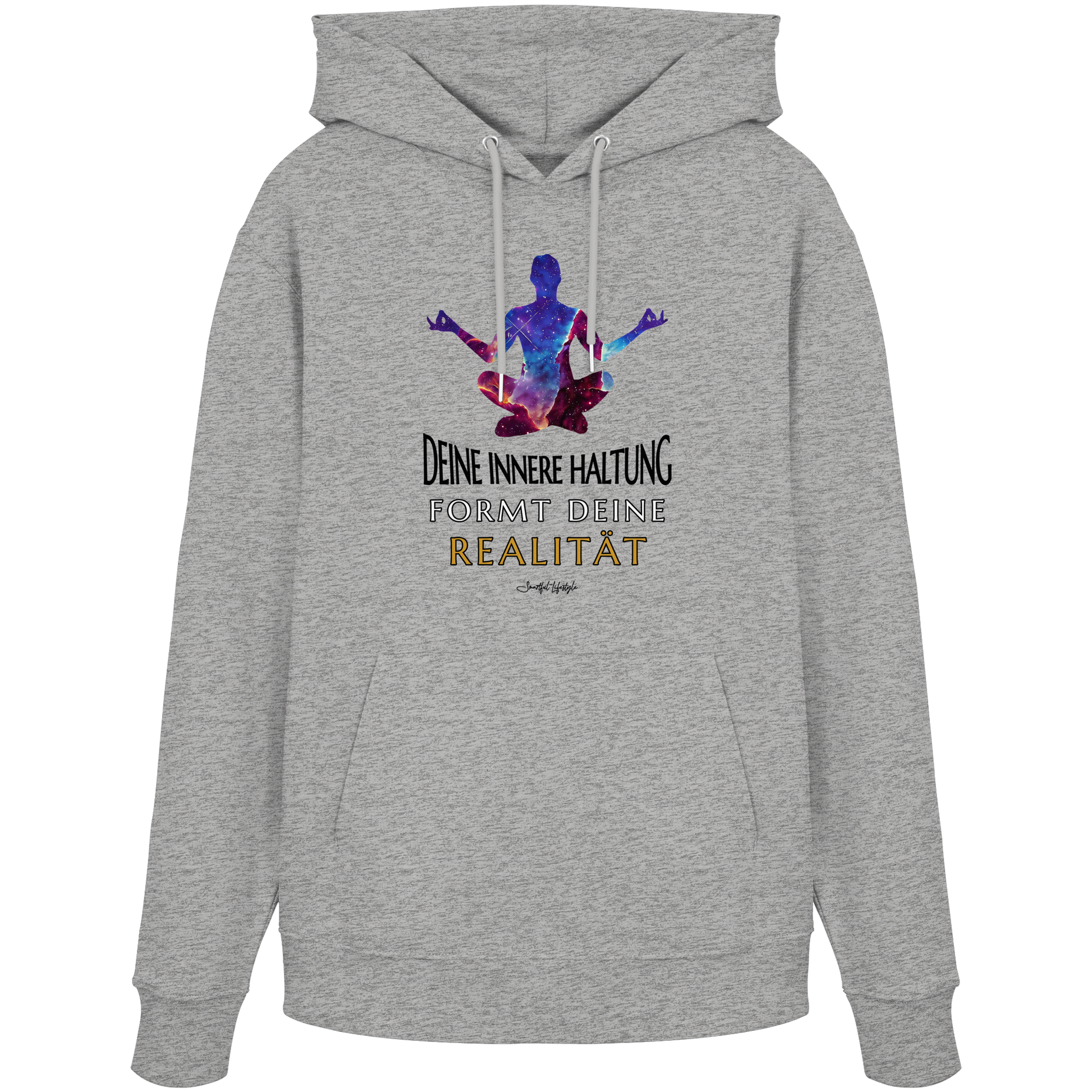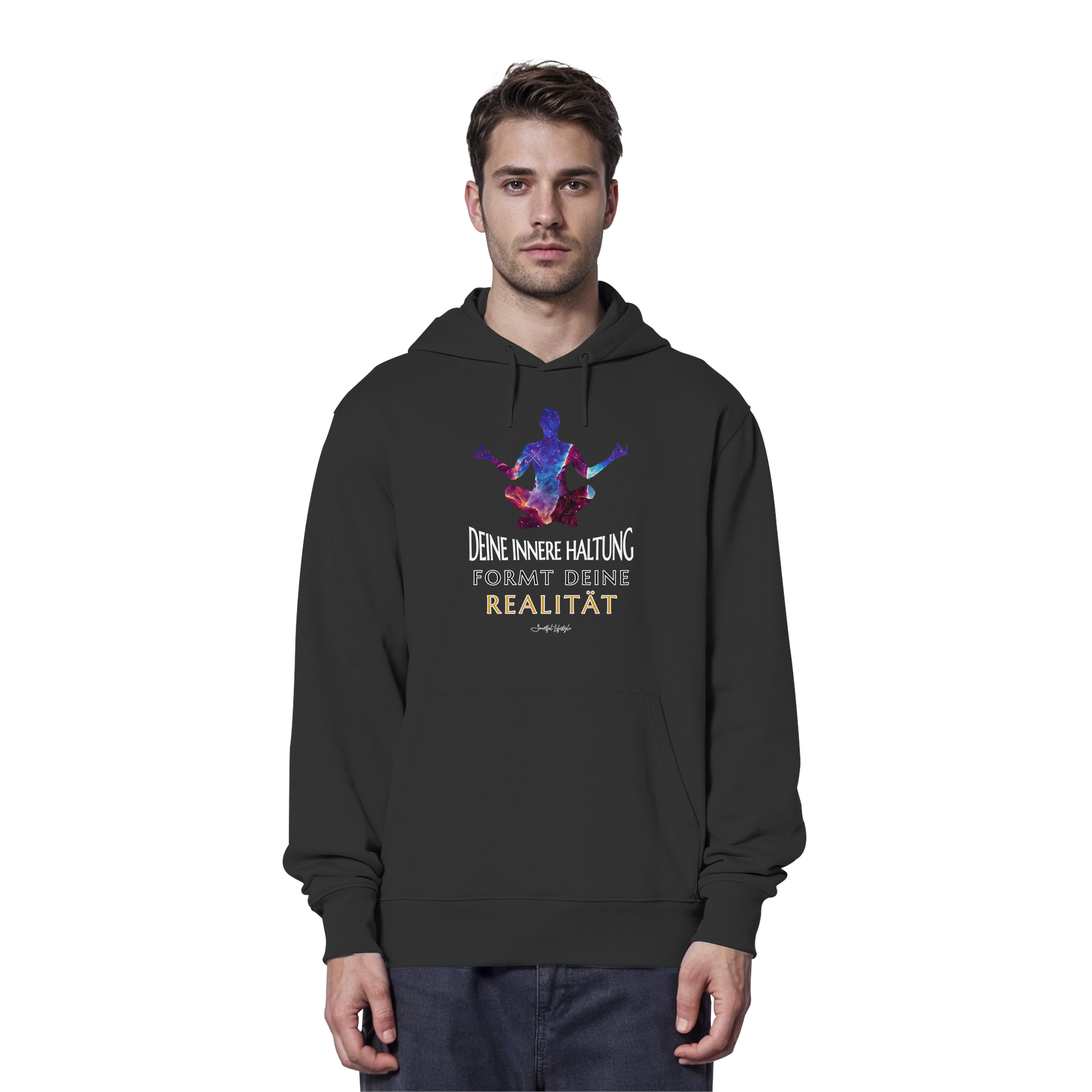 Erlebe die Kraft der inneren Klarheit mit unserem limitierten "Innere Haltung formt Realität" Organic Hoodie. Dieses einzigartige Design verkörpert die Symbiose von kosmischer Bildsprache und tiefgründiger Symbolik, um Dein wahres Ich zu inspirieren.
