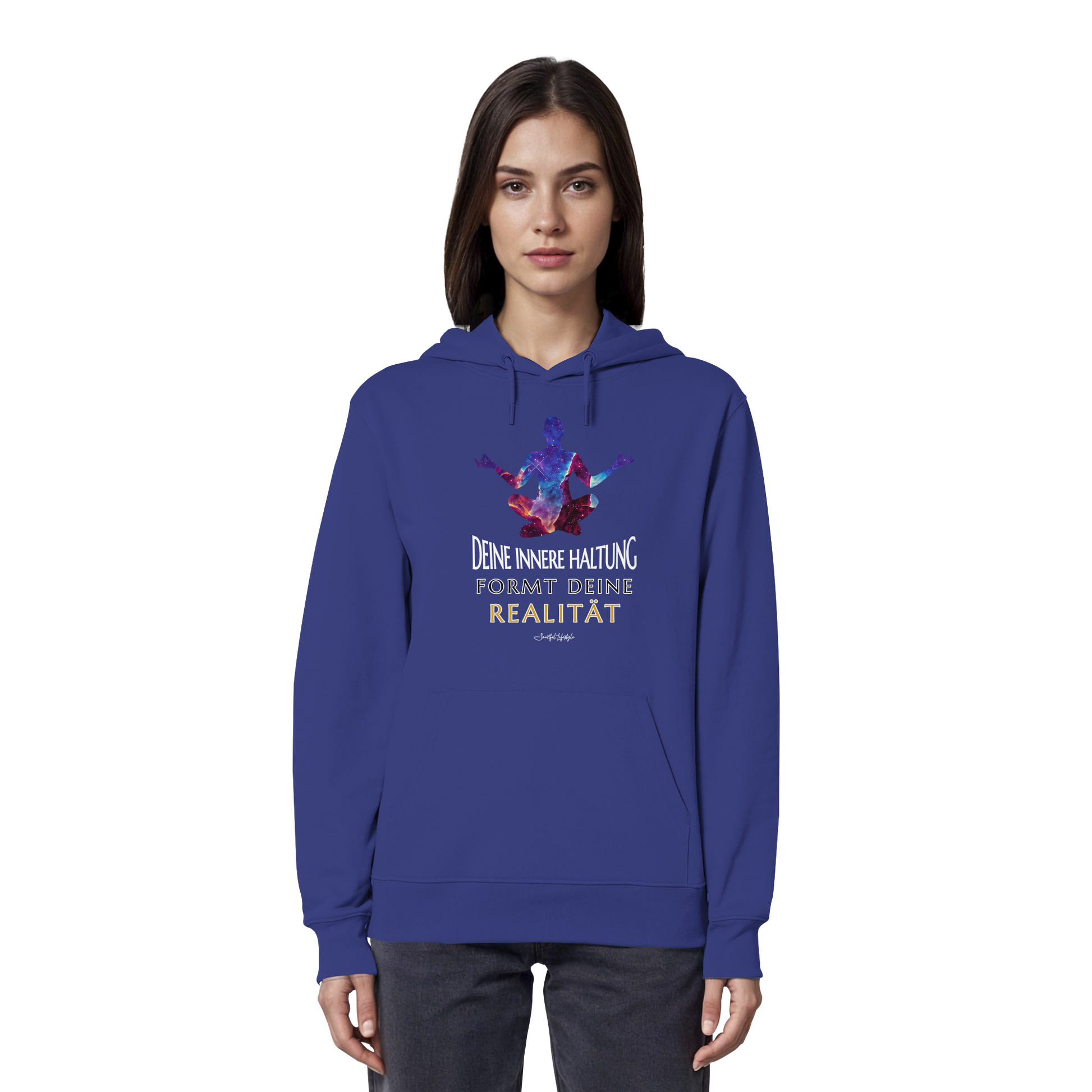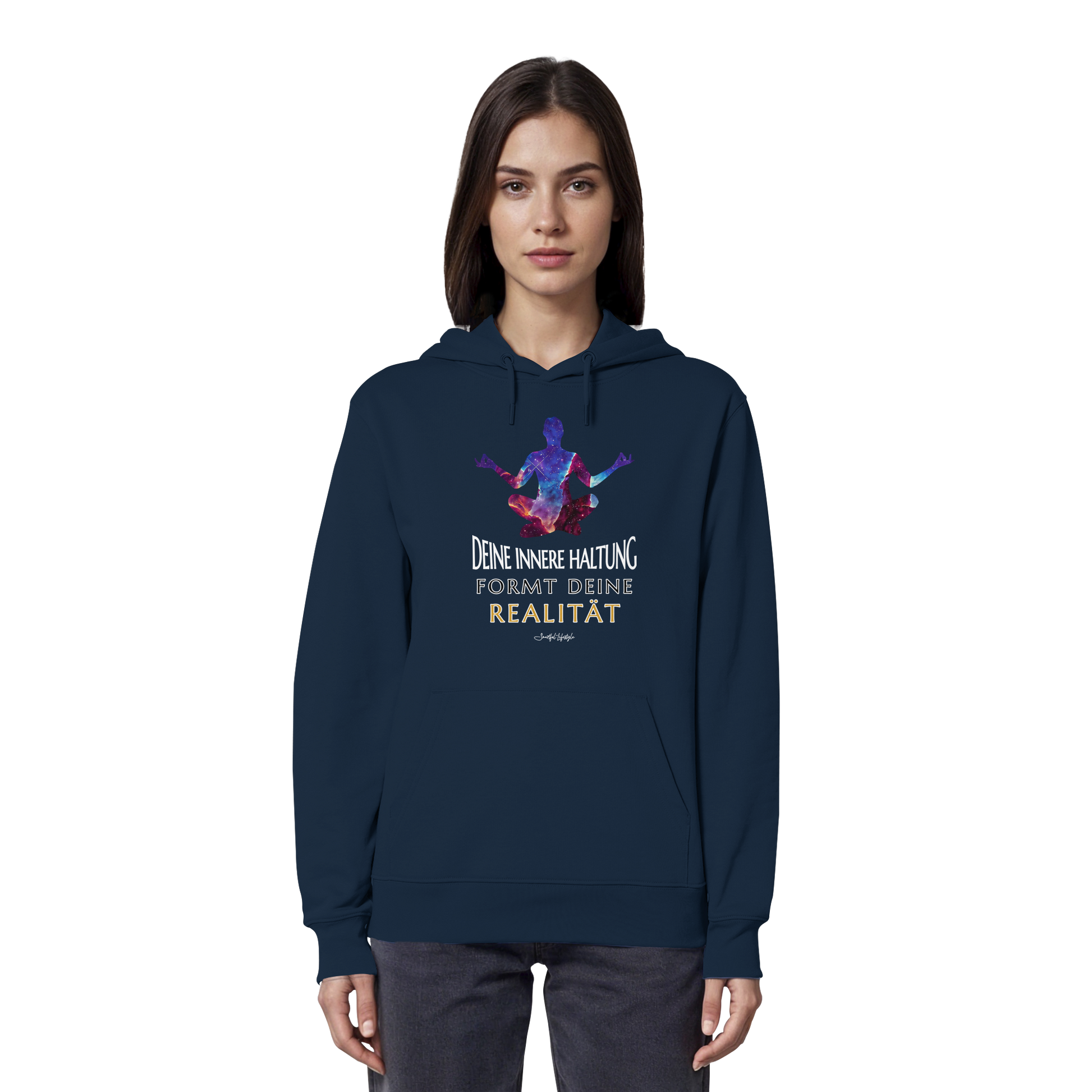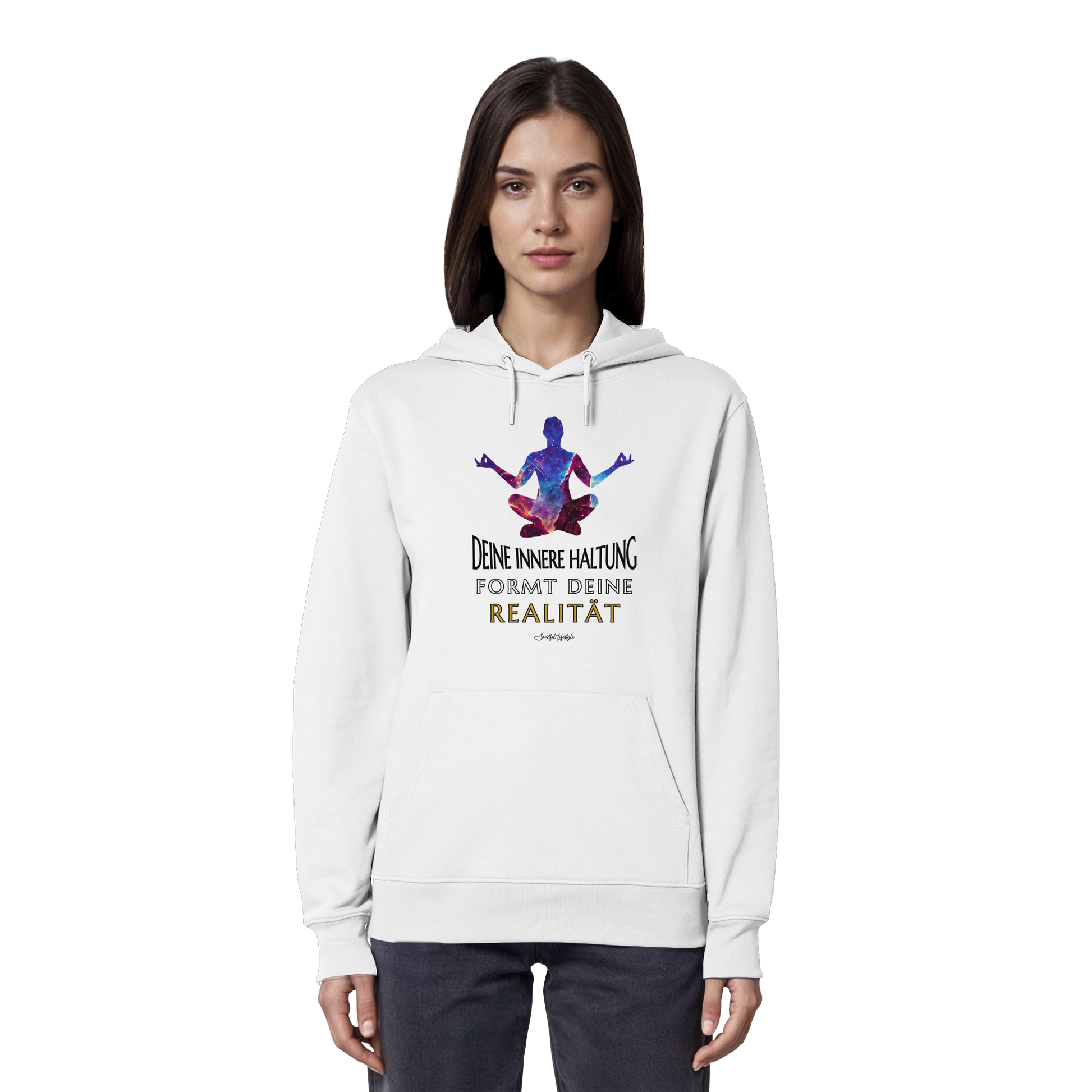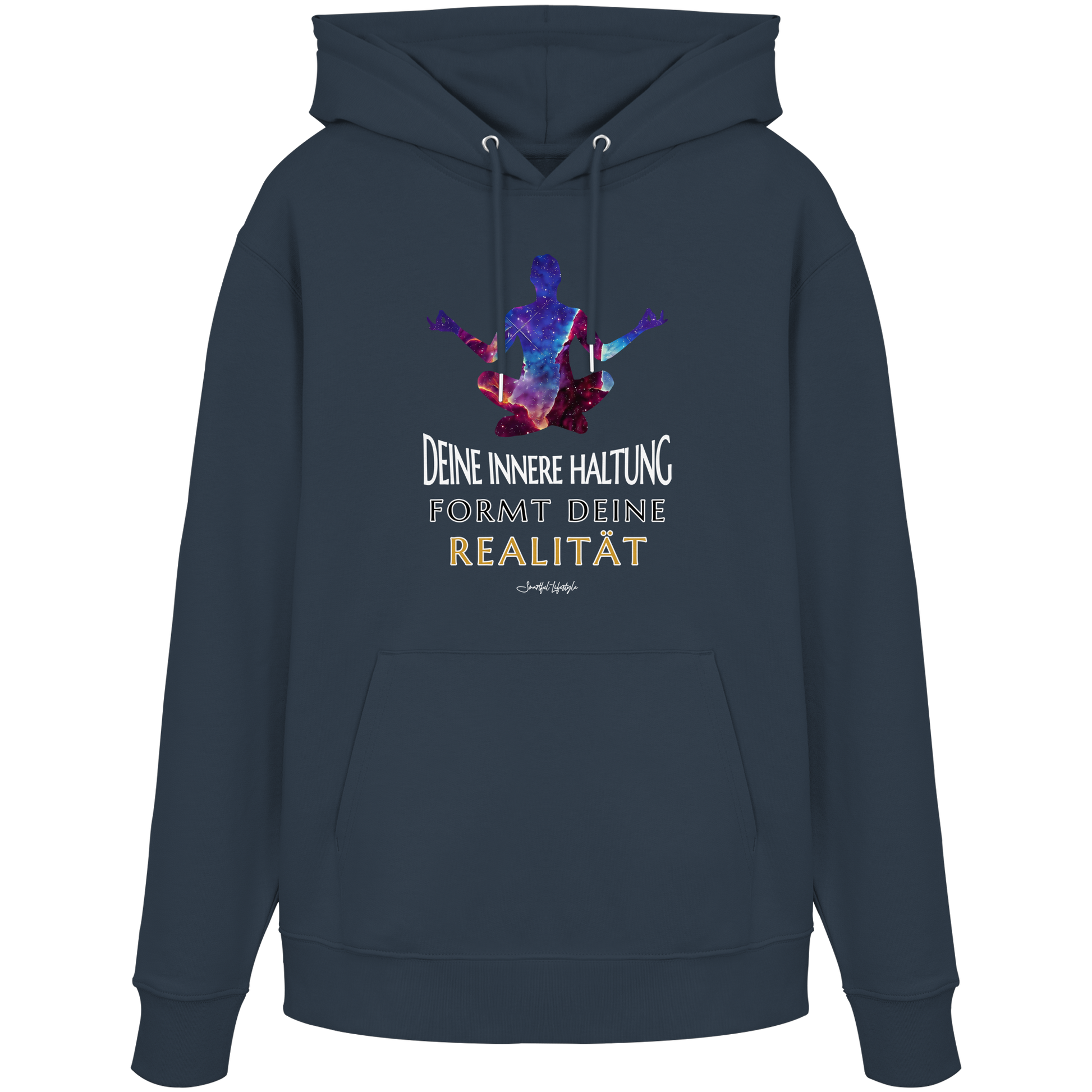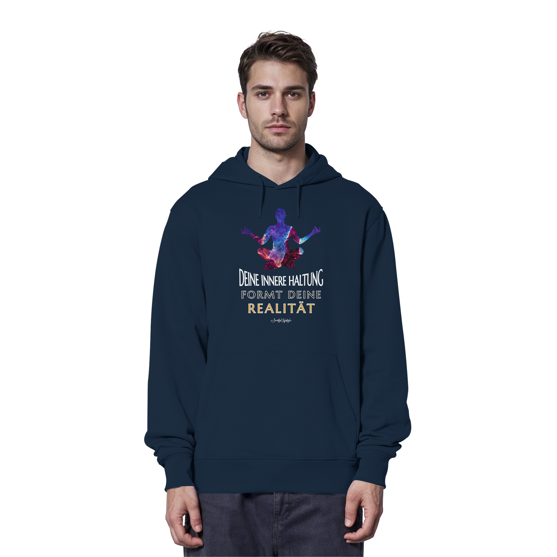 Erlebe die Kraft der inneren Klarheit mit unserem limitierten "Innere Haltung formt Realität" Organic Hoodie. Dieses einzigartige Design verkörpert die Symbiose von kosmischer Bildsprache und tiefgründiger Symbolik, um Dein wahres Ich zu inspirieren.