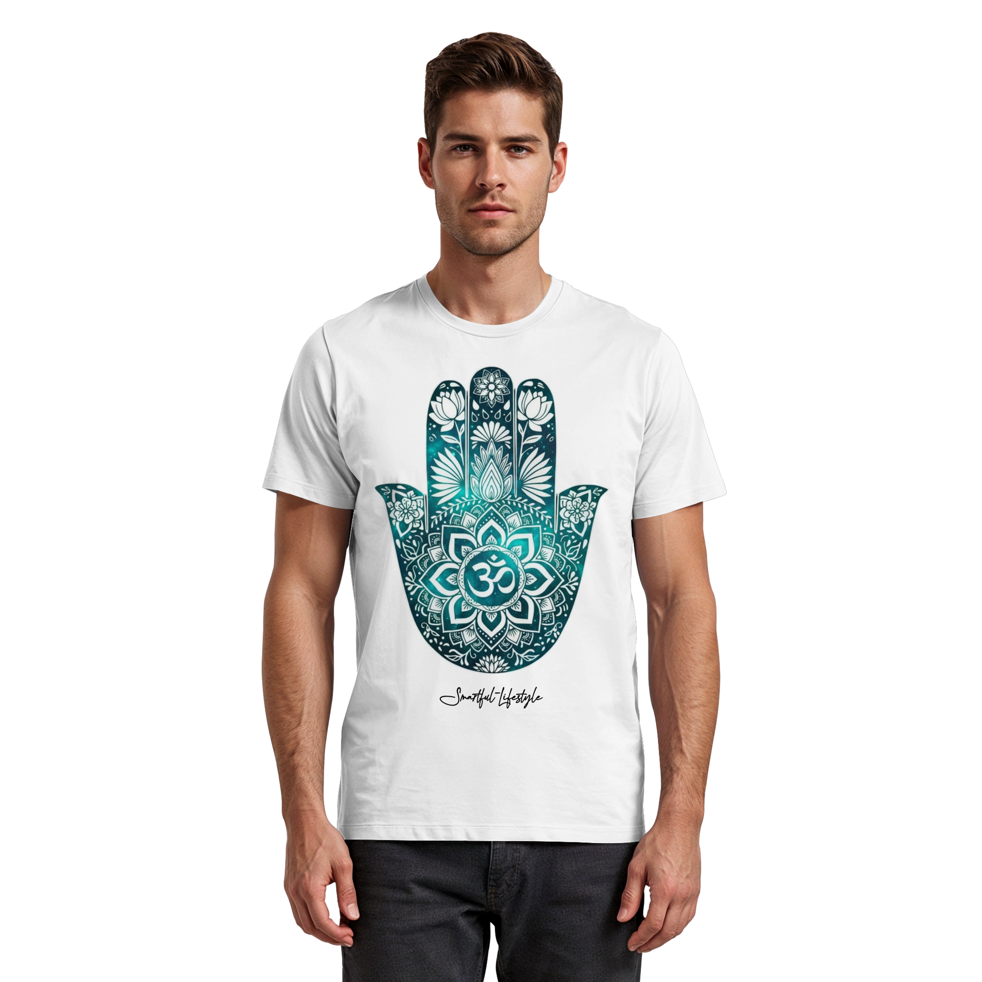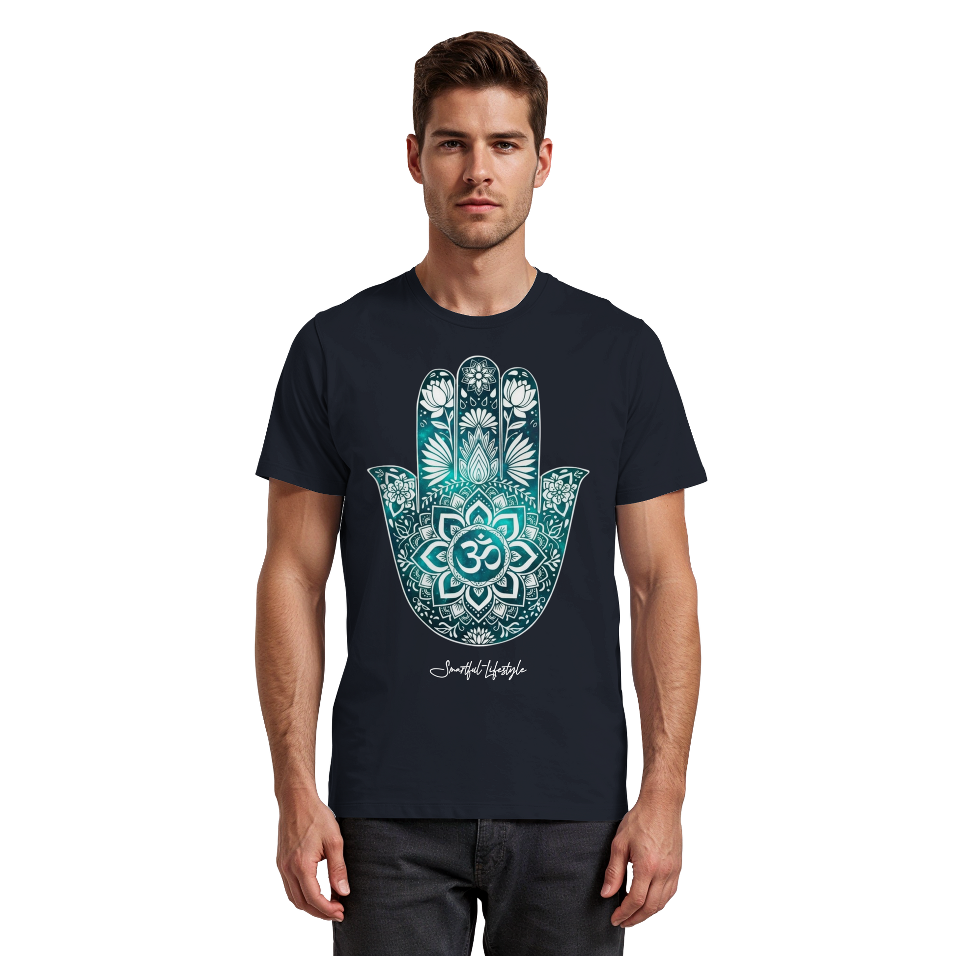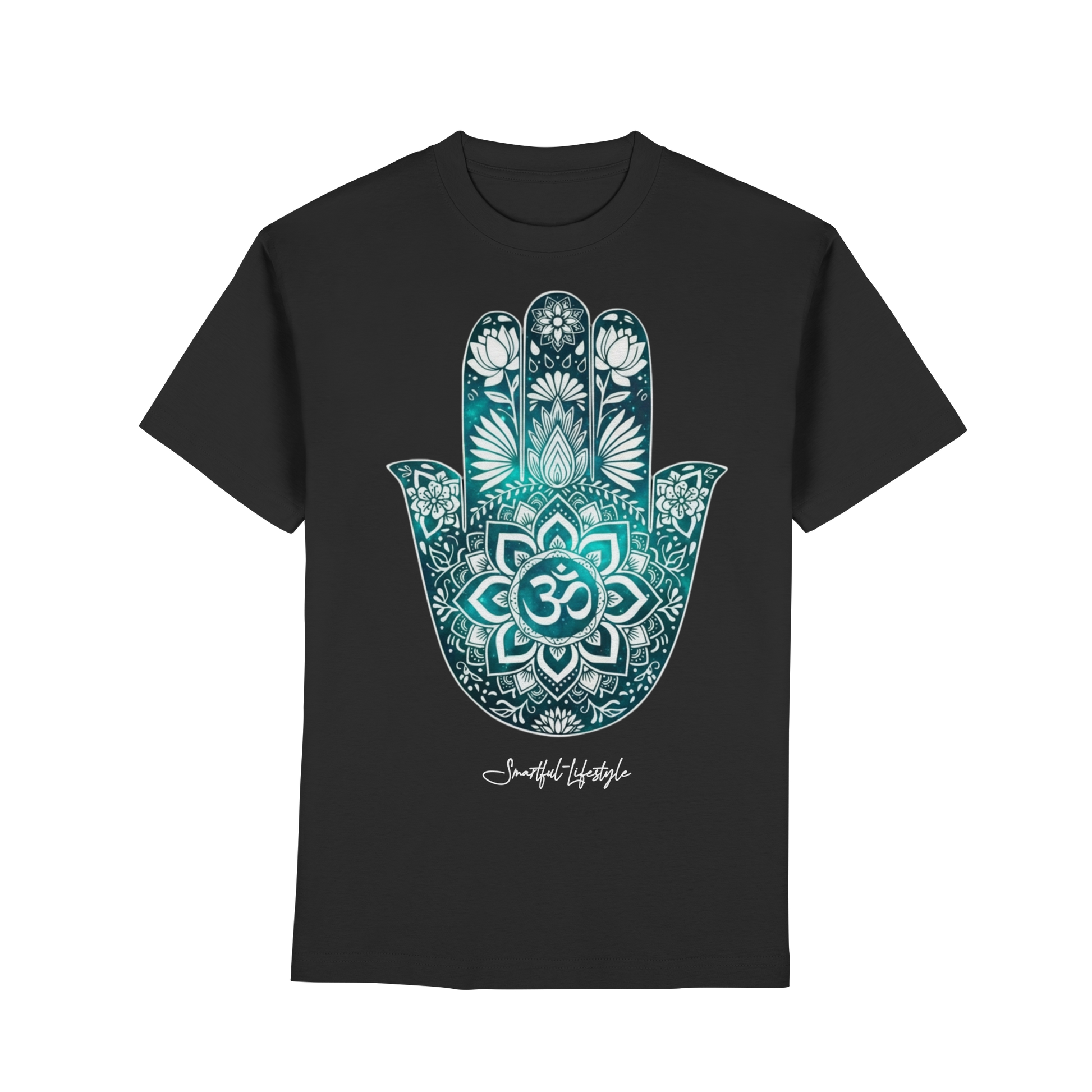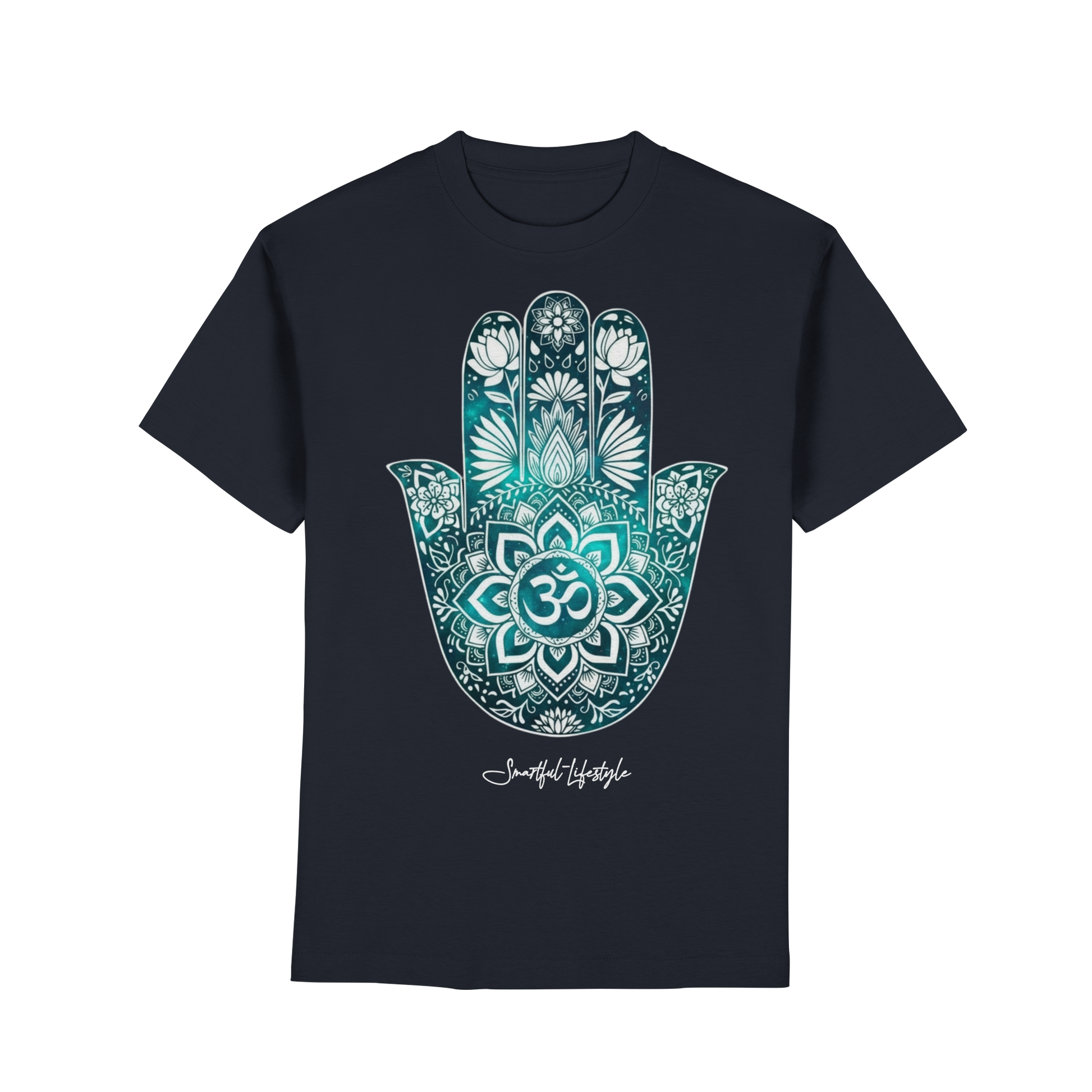 Ein stilles Gleichgewicht aus Linien, Ornamenten und Symbolen: Die schützende Hamsa-Hand öffnet sich nach vorn, während das Om-Zeichen im Zentrum ruht – kraftvoll, klar, unbewegt.