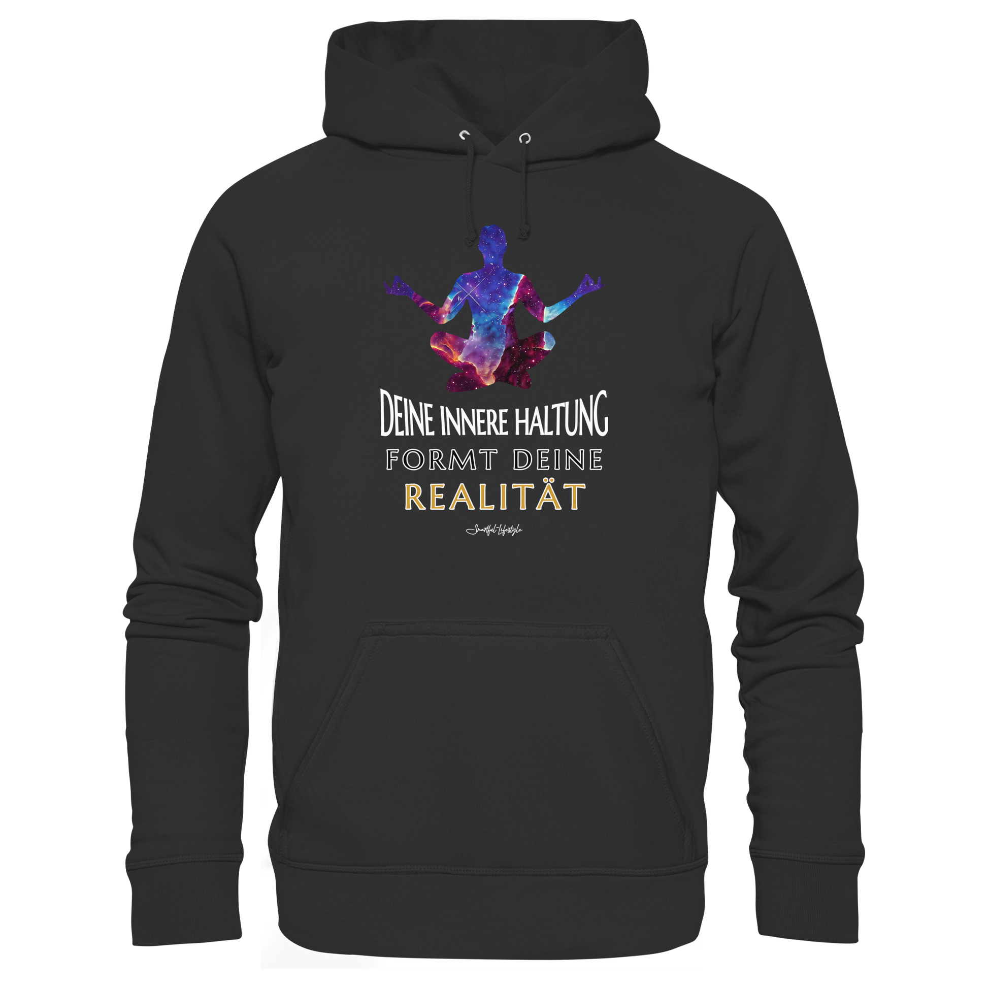 Unser 'Innere Haltung formt Realität' Premium Hoodie ist mehr als nur ein Kleidungsstück – es ist eine Reise zu deinem inneren Selbst. Das Design zeigt einen meditierenden Silhouetten-Umriss, durchzogen von einem kosmischen Farbenspiel, das die Unendlichkeit und den inneren Frieden symbolisiert.