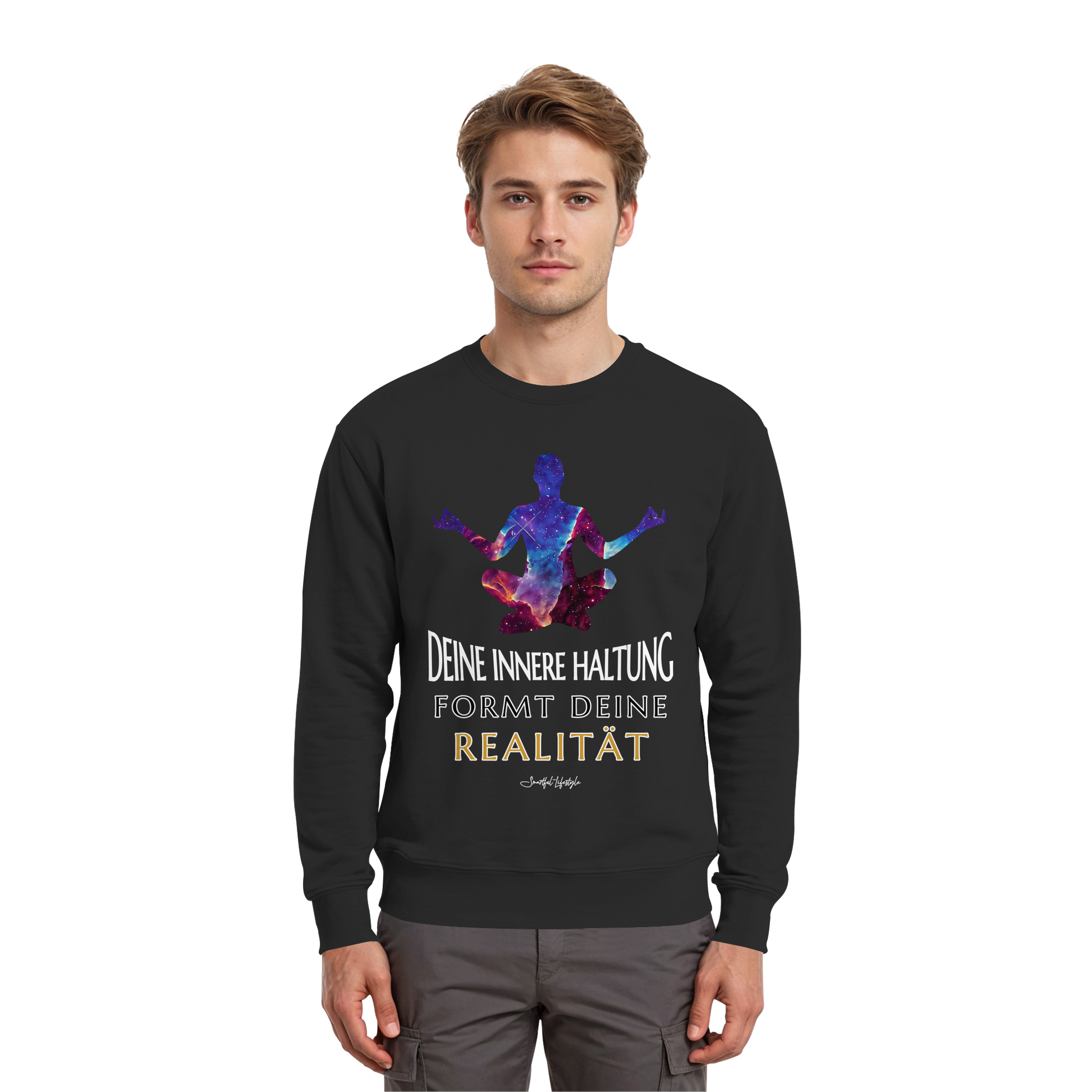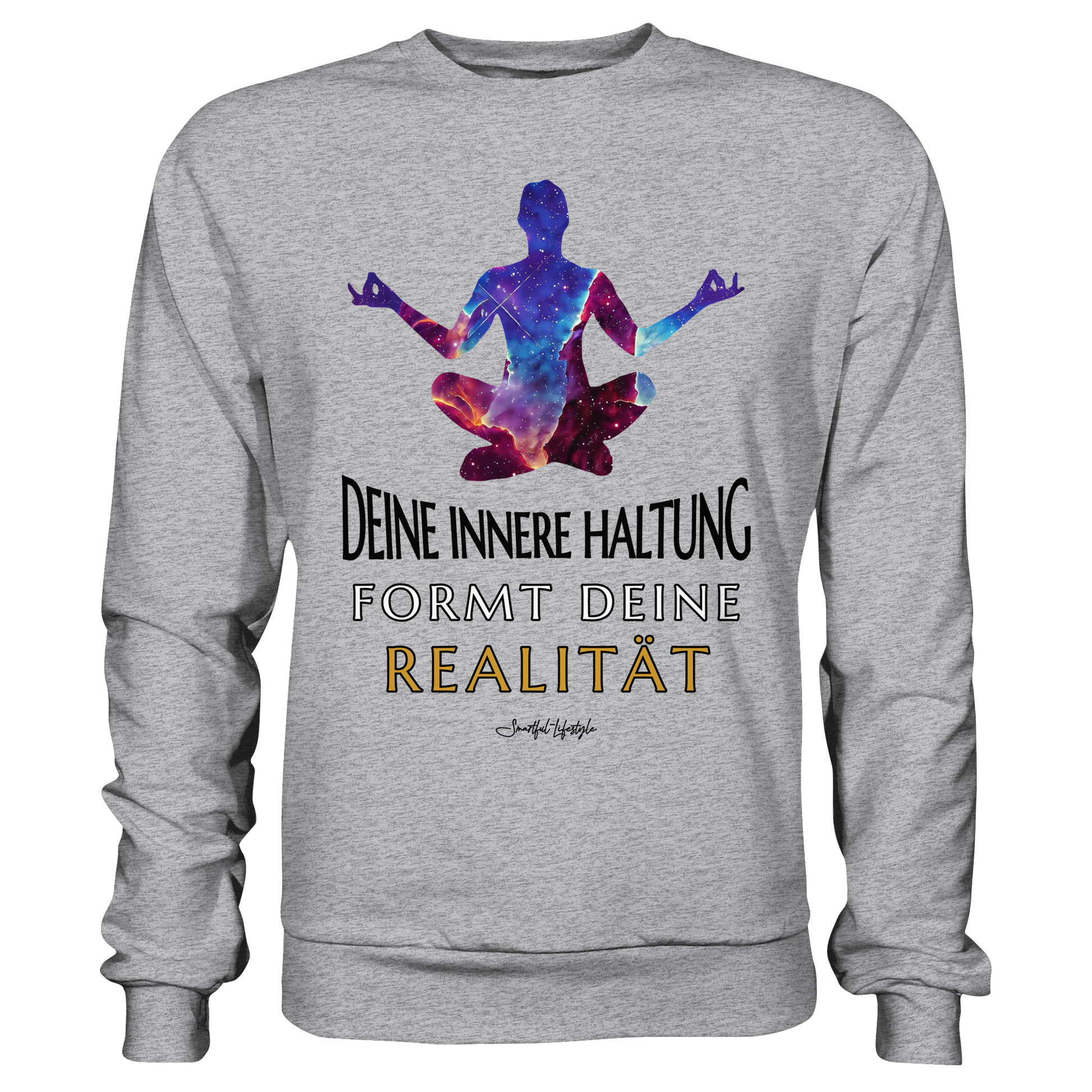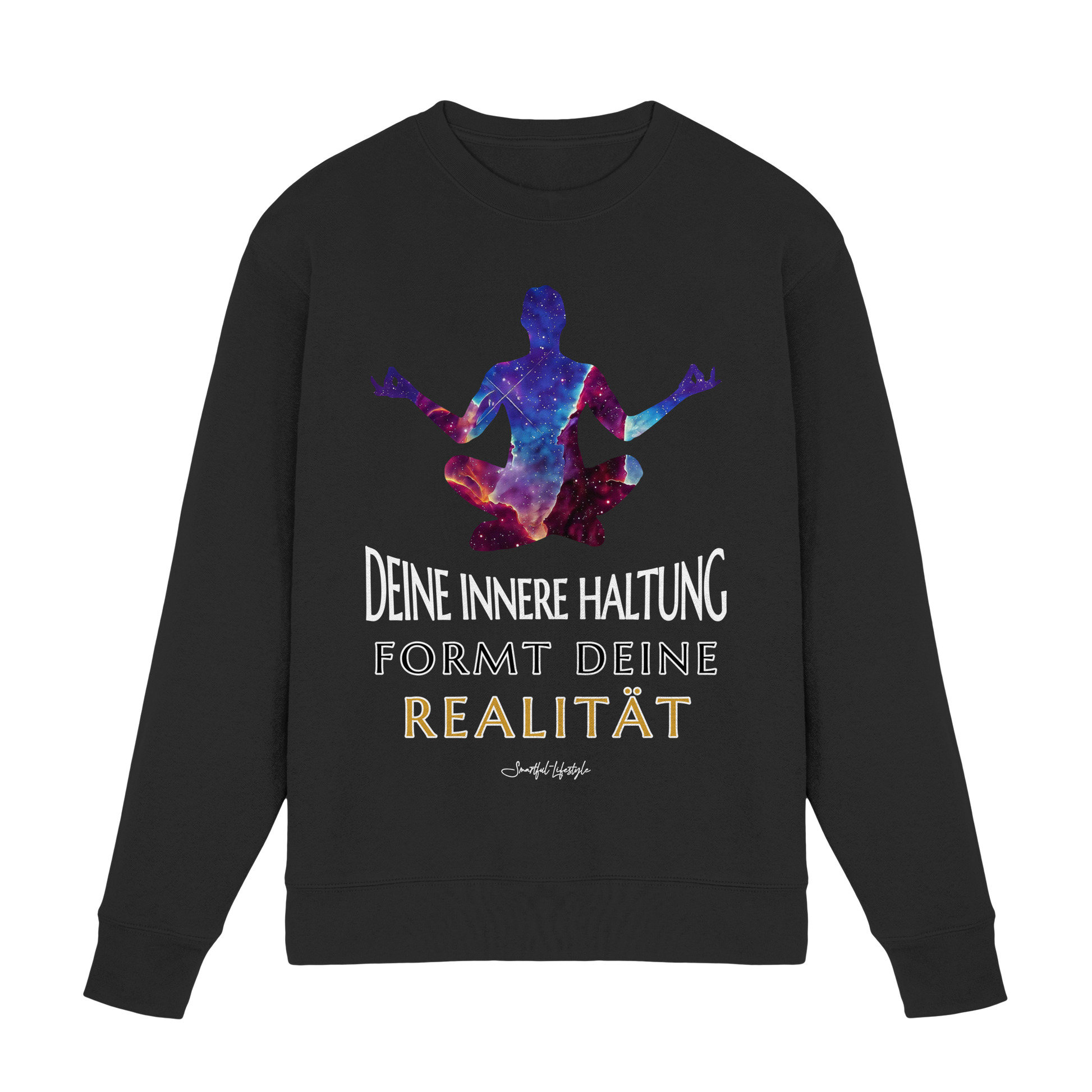 Erleben Sie das Gefühl von innerer Klarheit und Bewusstsein mit unserem "Innere Haltung formt Realität - Signature Sweatshirt". Dieses einzigartige Design verbindet Text, Symbolik und kosmische Bildsprache, um Ihre innere Haltung zu stärken und Ihre Realität zu formen.