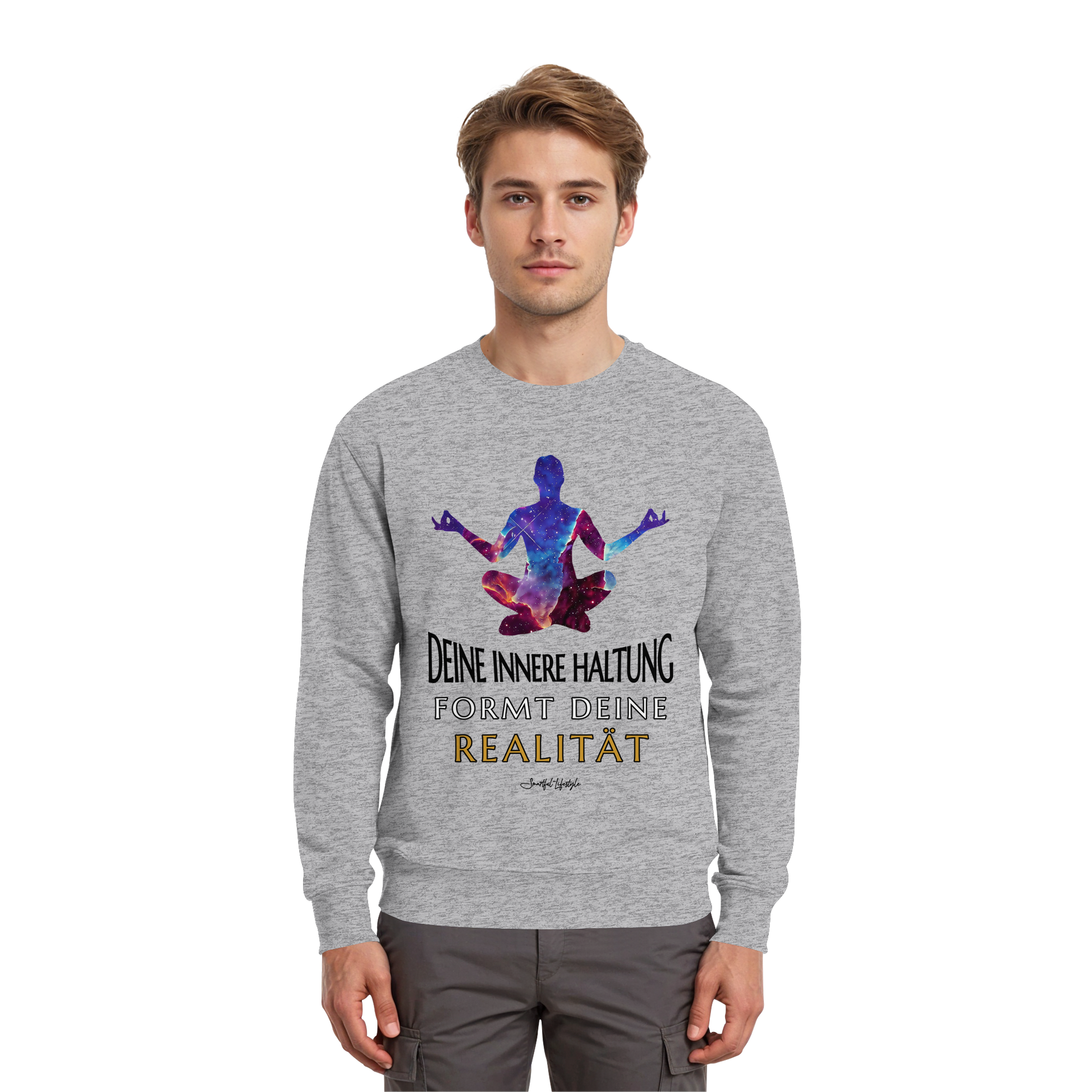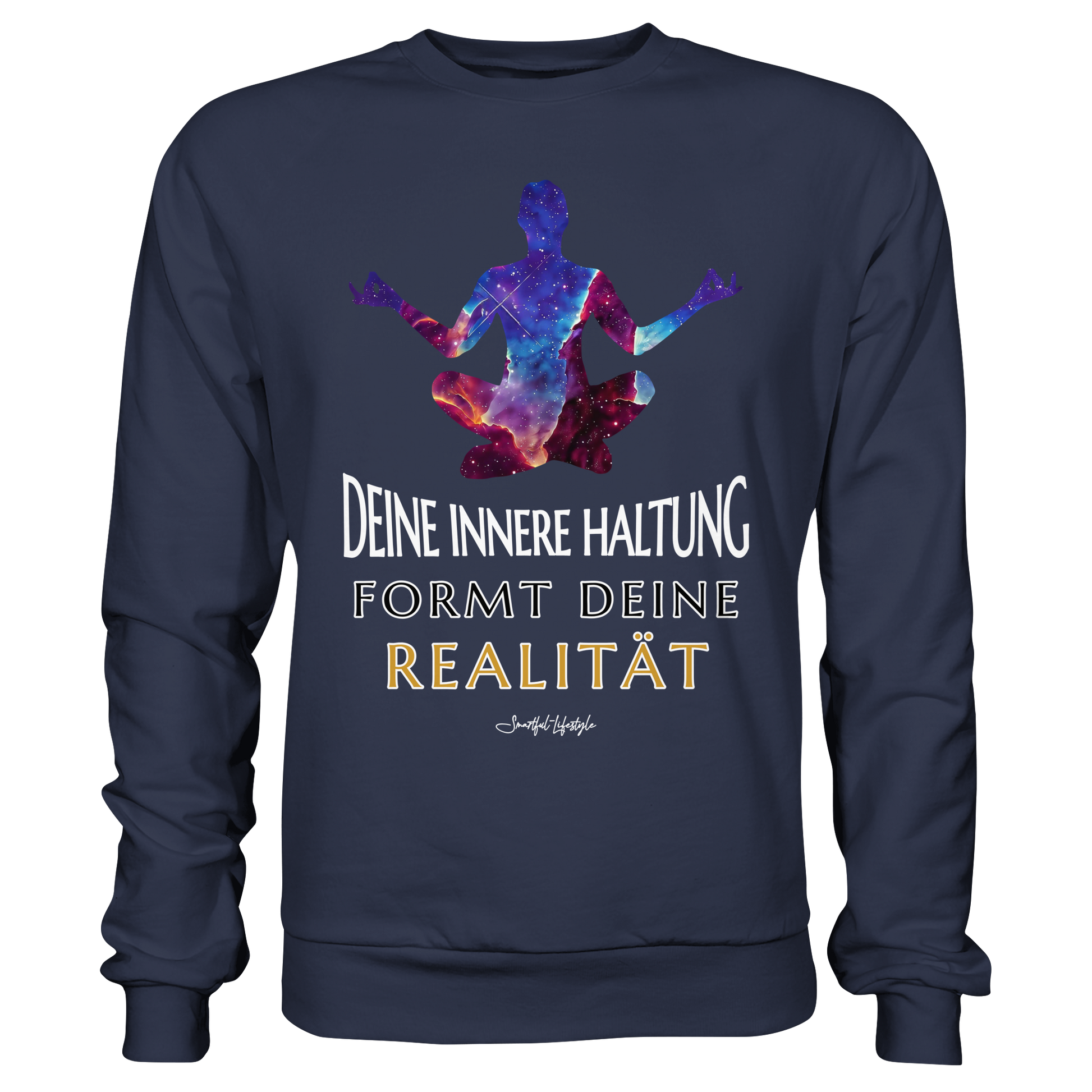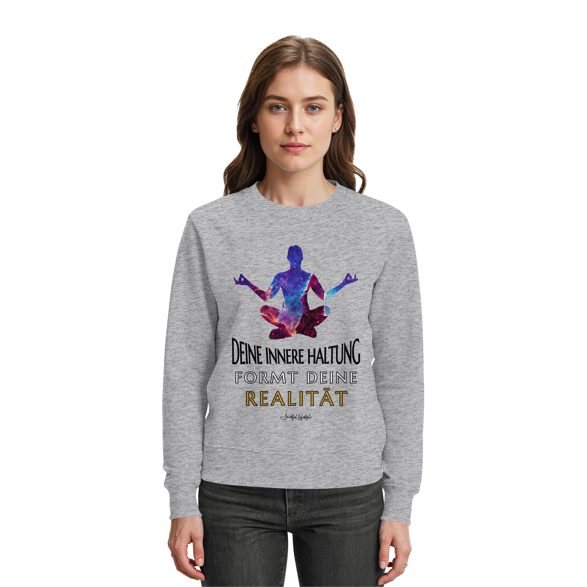 Erleben Sie das Gefühl von innerer Klarheit und Bewusstsein mit unserem "Innere Haltung formt Realität - Signature Sweatshirt". Dieses einzigartige Design verbindet Text, Symbolik und kosmische Bildsprache, um Ihre innere Haltung zu stärken und Ihre Realität zu formen.